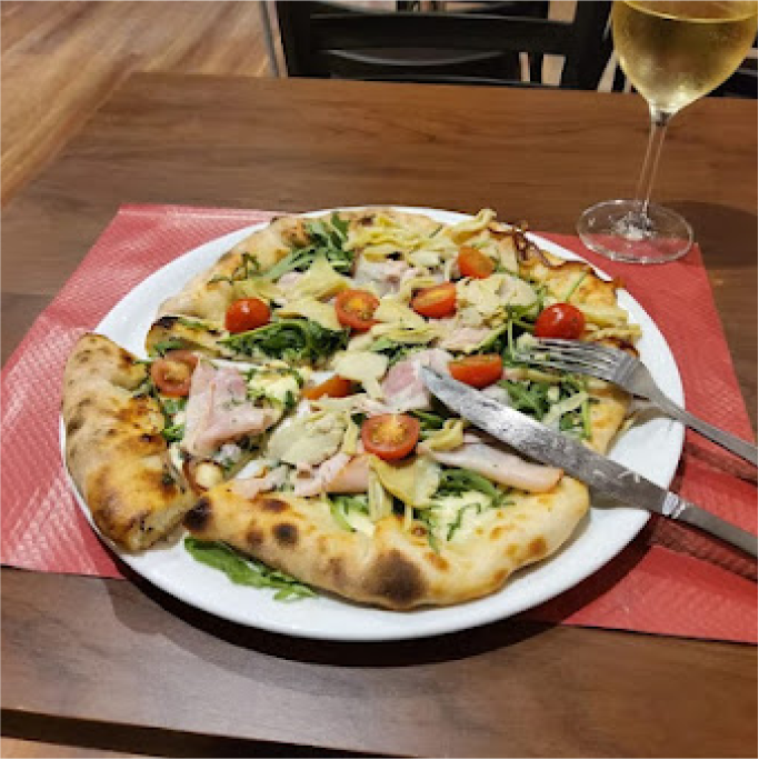 Crème de gorgonzola, fleur de lait, roquette, tomates cerise, Mortadella, artichaut et la pate farcie à la ricotta et ciboulette - Gorgonzola cream, Mozzarella, rocket, Artichoke, cherry